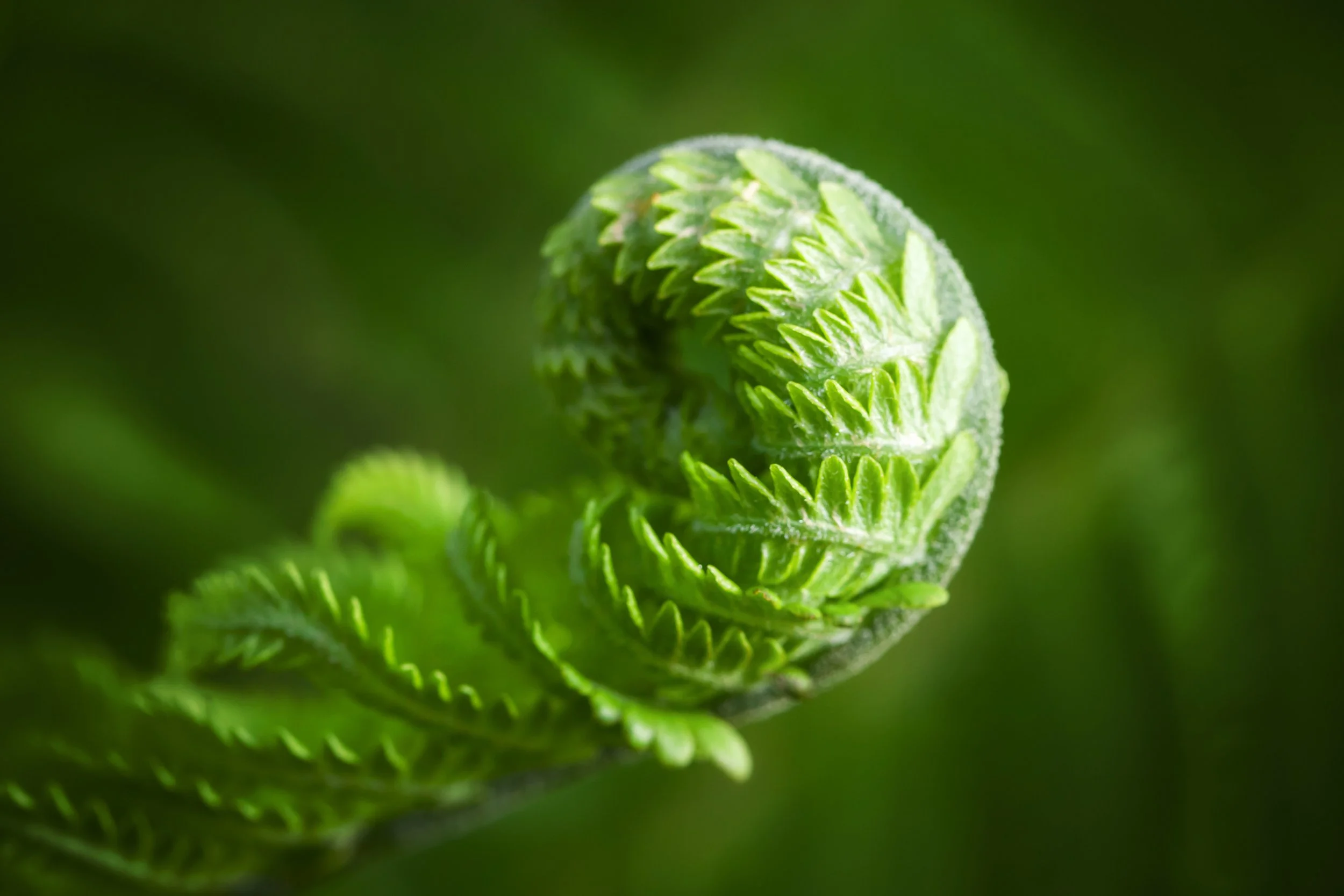 Above the blog text, there is an image of a tender green fern unfurling its leaves and stem.