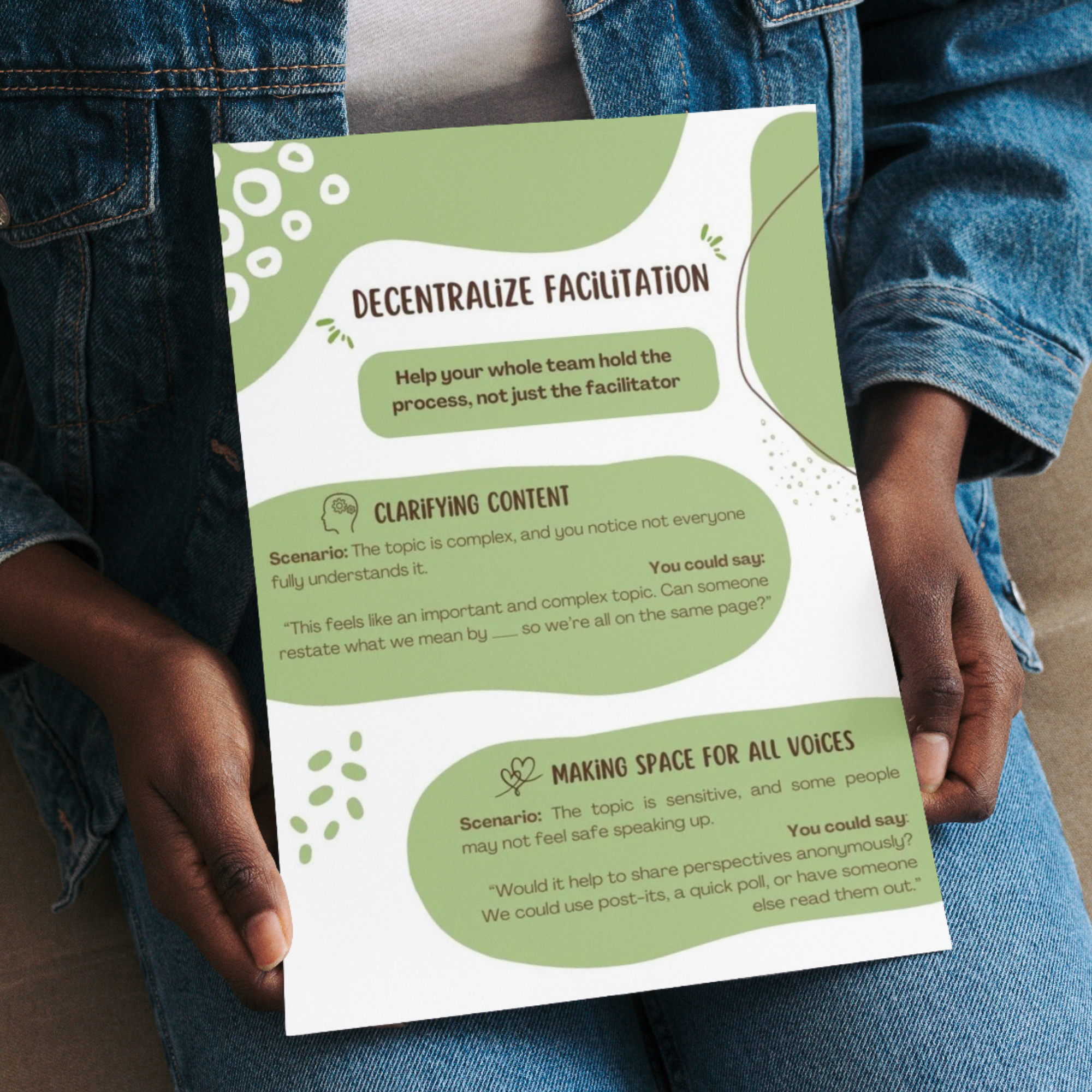 This one-page infographic offers concrete scenarios and phrases anyone on your team can use to clarify content, make space for all voices, confirm decisions, and re-center on the meeting's purpose when you drift from it.